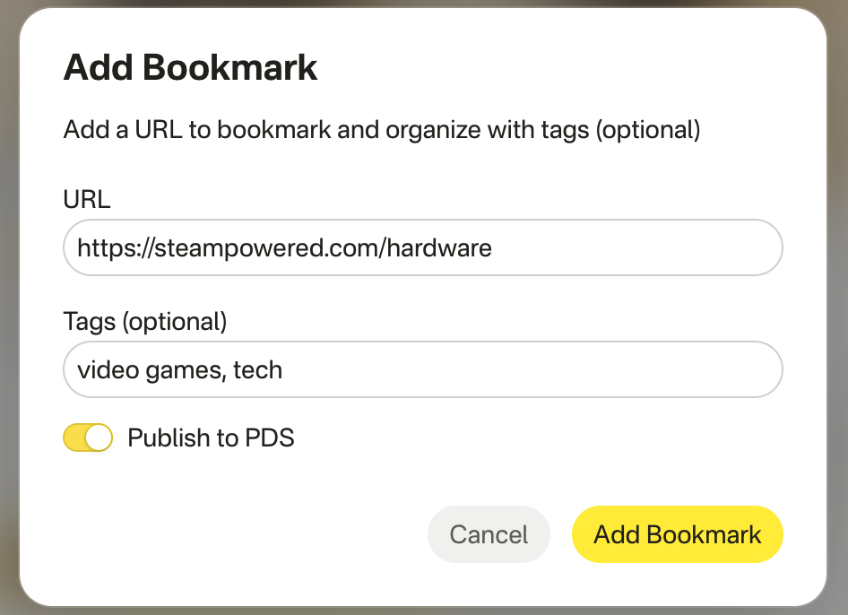 First, all data in your PDS is public. This is why Bluesky doesn't have private accounts or posts. For this reason, you must opt-in to publishing a bookmark to your PDS every time, and is why I chose the verb "publish." If PDSes ever gain the ability to host private data, I will change this behavior so you can publish all bookmarks, private or public, to your PDS. For now, private bookmarks will remain in Sill's database.
