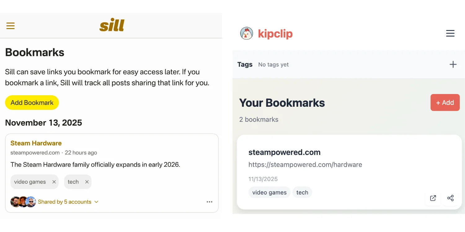 There is more to do to round out the bookmarking feature. Obviously, links bookmarked by the people you follow should end up in your Sill feed. And you should have more ways to get bookmarks into Sill, like bookmarklets and iOS shortcuts.