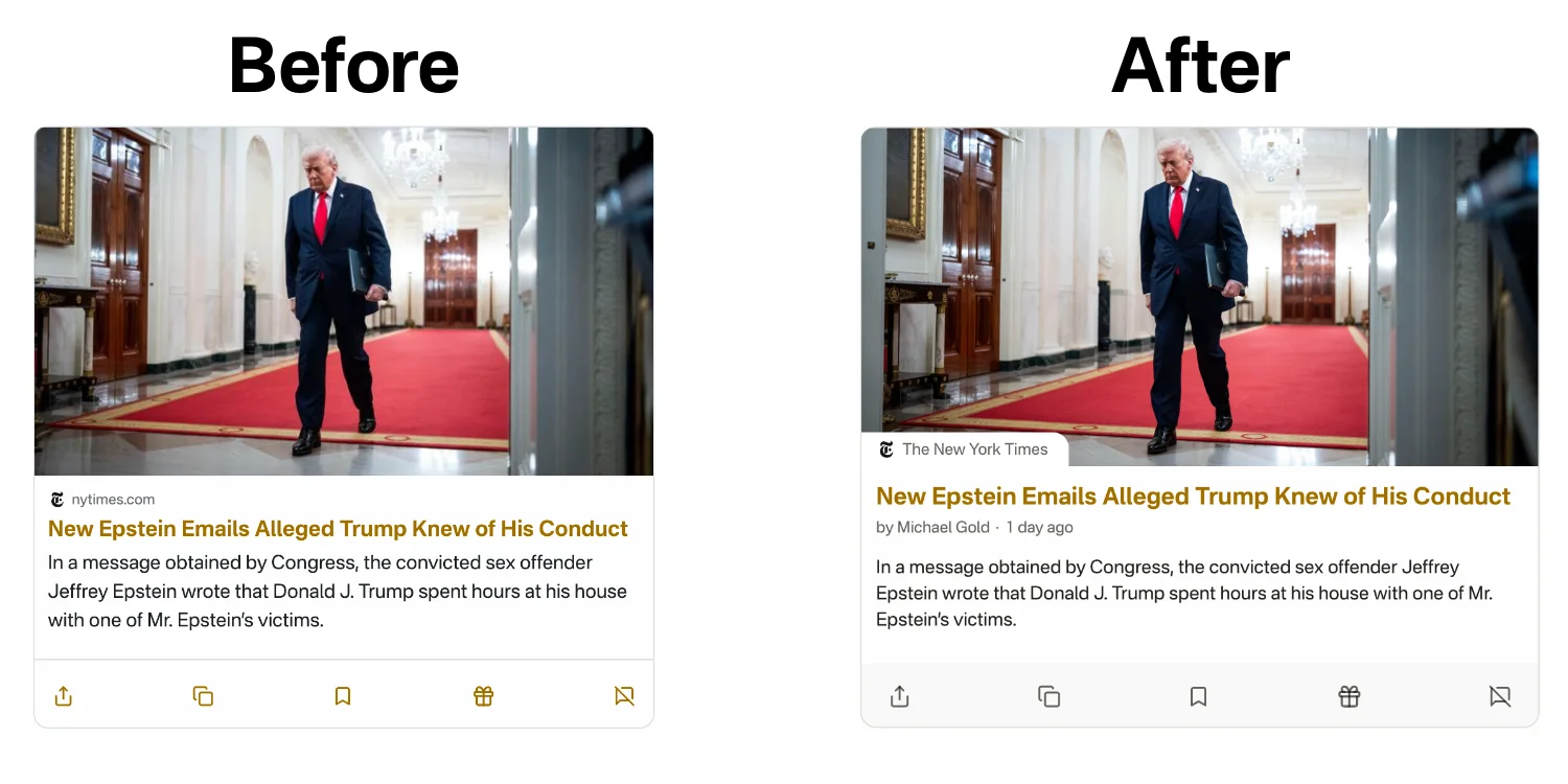 First, link cards have a sleeker look to accommodate the enhanced link metadata. You will now get the site name instead of the domain, when available, as well as a new set of data showing the author and how long ago the article was published, when available.